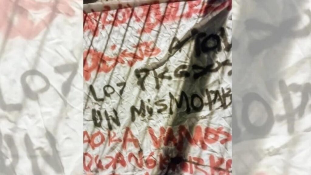 La tela escrita con pintura roja y negra apareció en un puente ubicado en Circunvalación entre Mendoza y Eva Perón.