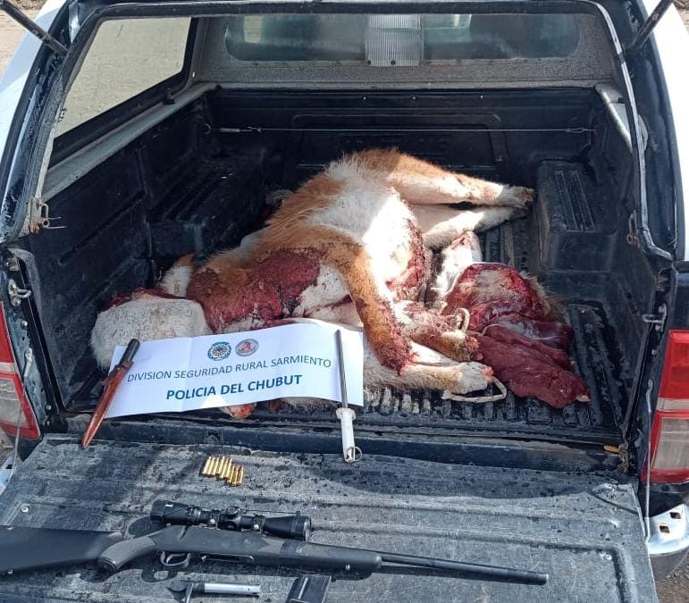 El sujeto, que es de la localidad de Sarmiento, no contaba con permiso de campo y por causa de que en la región existe una veda de caza de esta especie, se procede a realizar las medidas correspondientes por infracción de la Ley XXI Nro 10- de Flora y Fauna, se confisca la carne por no encontrarse apta para el consumo y se secuestra el armamento.