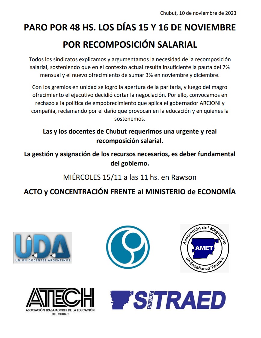 «Las y los docentes de Chubut requerimos una urgente y real recomposición salarial» añade y remarca la convocatoria «en rechazo a la política de empobrecimiento que aplica el gobernador Arcioni».