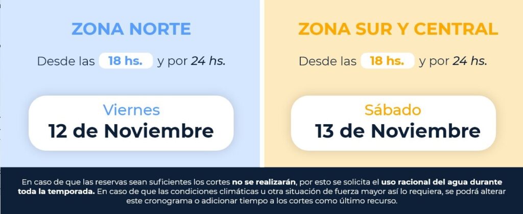 La administración informó: «CORTE DE AGUA PROGRAMADO EN COMODORO PARA RECUPERAR RESERVAS. Se interrumpe el suministro de agua potable el viernes 12 de noviembre, desde las 18hs y por 24hs en Zona Norte y sábado 13, desde las 18hs y por 24hs en Zona Sur y Central».
