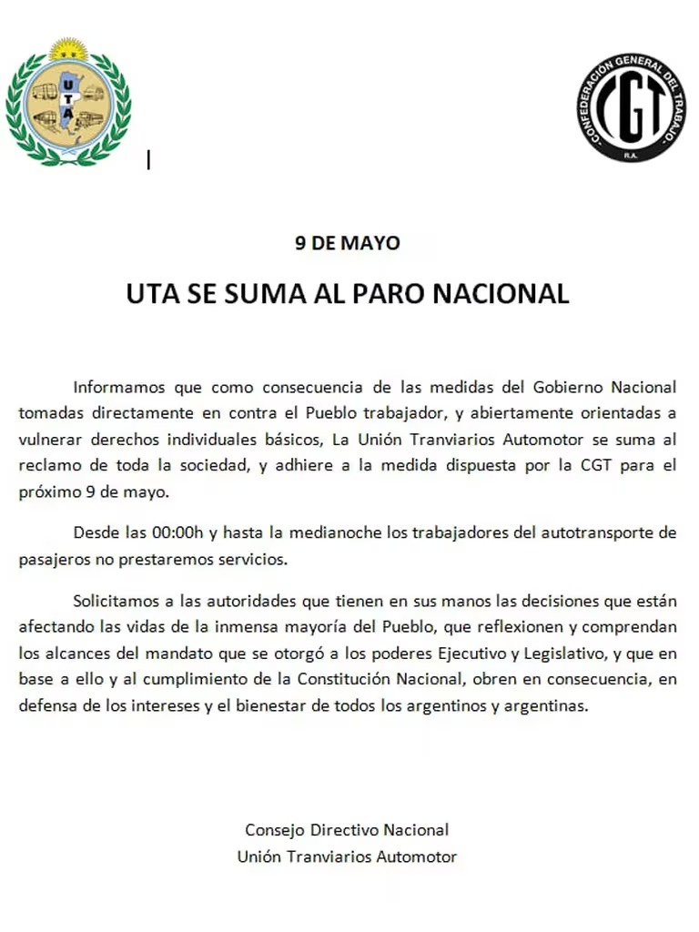 «Informamos que como consecuencia de las medidas del Gobierno Nacional tomadas directamente en contra del pueblo trabajador, y abiertamente orientadas a vulnerar derechos individuales básicos, La Unión Tranviarios Automotor se suma al reclamo de toda la sociedad, y adhiere a la medida dispuesta por la CGT», precisó la publicación que realizaron.