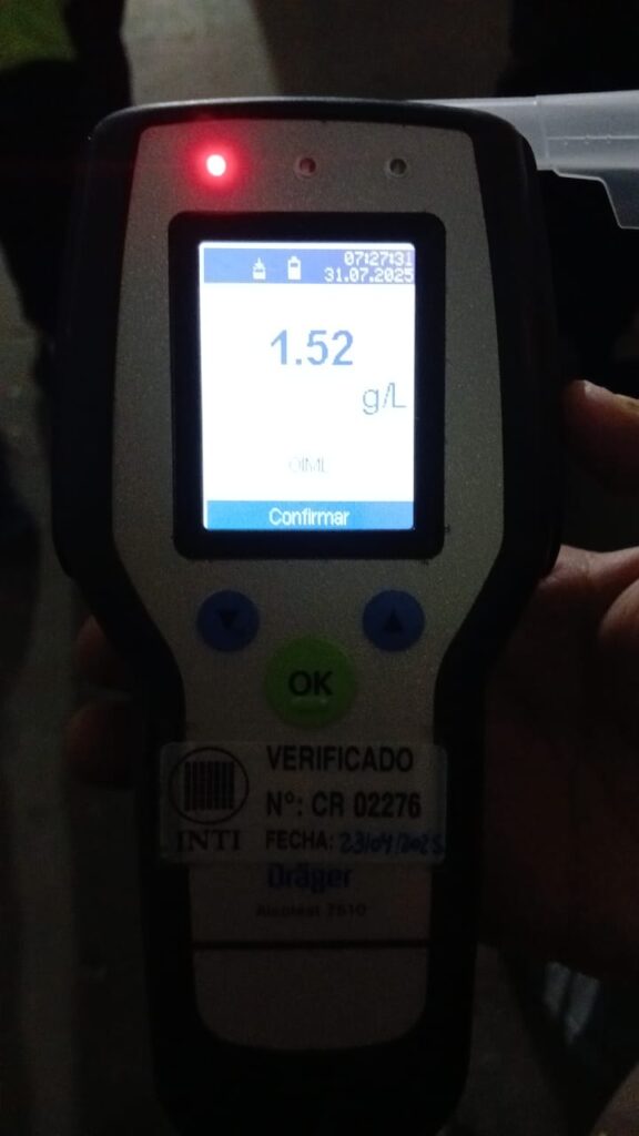 Posteriormente, el hombre fue trasladado a la sede policial, donde personal de Tránsito Municipal le realizó un test de alcoholemia que arrojó un resultado positivo de 1,52 g/L. En consecuencia, se procedió a la aprehensión del individuo por infracción a la Ley Nacional de Tránsito. El vehículo, por su parte, quedó retenido en el lugar a la espera de ser secuestrado, ya que Tránsito Municipal no contaba con una grúa disponible en el momento.