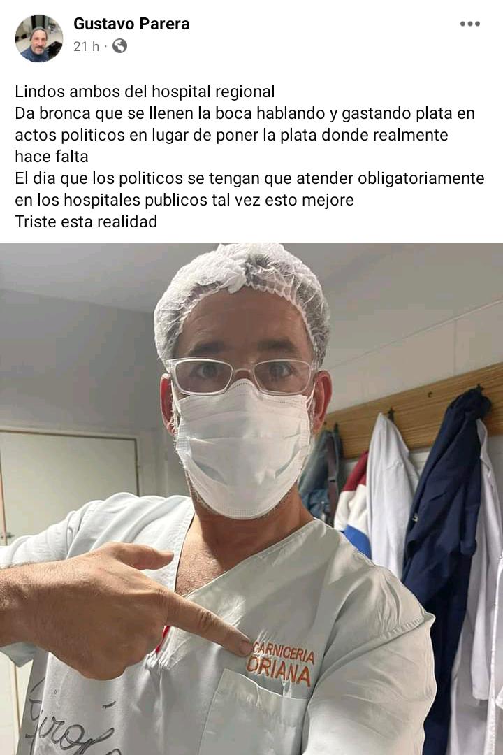 El doctor Gustavo Parera compartió la imagen en su perfil y expresó: «Lindos ambos del hospital regional. Da bronca que se llenen la boca hablando y gastando plata en actos politicos en lugar de poner la plata donde realmente hace falta. El día que los políticos se tengan que atender obligatoriamente en los hospitales publicos tal vez esto mejore