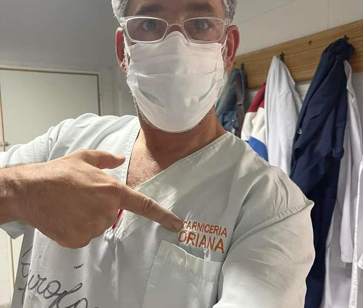 A través de las redes sociales, se hizo viral una foto que exhibe a un doctor del Hospital Regional utilizando un ambo de la carnicería «Oriana» debido a la falta de insumos en el establecimiento.