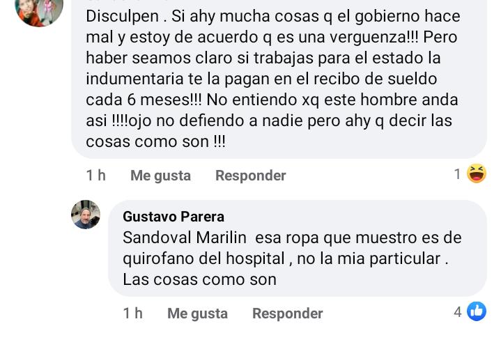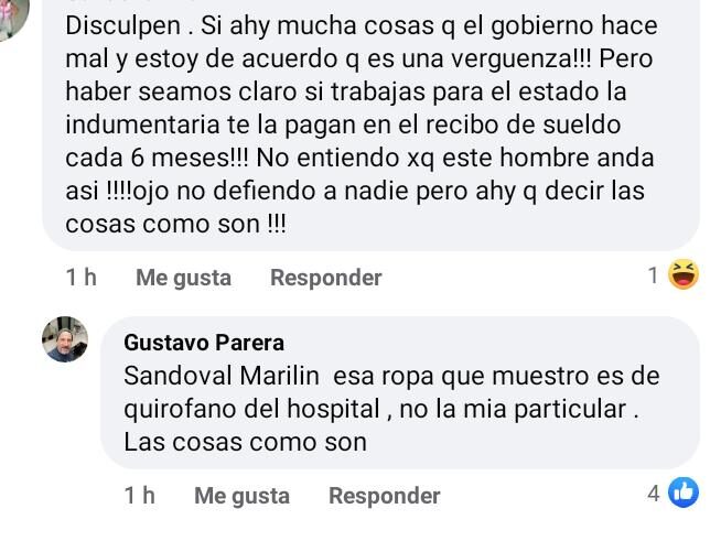 Ante esta publicación, una usuario comentó: «Si hay muchas cosas que el gobierno hace mal y estoy de acuerdo! Pero seamos claros, si trabajas para el estado la indumentaria te la pagan en el recibo de sueldo cada 6 meses». Inmediatamente, el dueño del perfil respondió: «Esa ropa que muestro es del quirófano del hospital, no la mía particular. Las cosas como son».