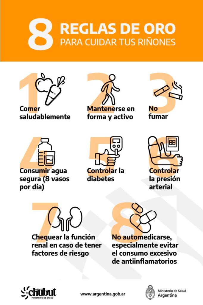 El Ministerio de Salud del Chubut, a través de la Dirección Provincial de Promoción y Prevención de la Salud, difundió las 8 reglas de oro dirigidas a toda la población para prevenir las enfermedades renales, en ocasión de conmemorarse este jueves el “Día Mundial del Riñón”, que se celebra el 10 de marzo de cada año.