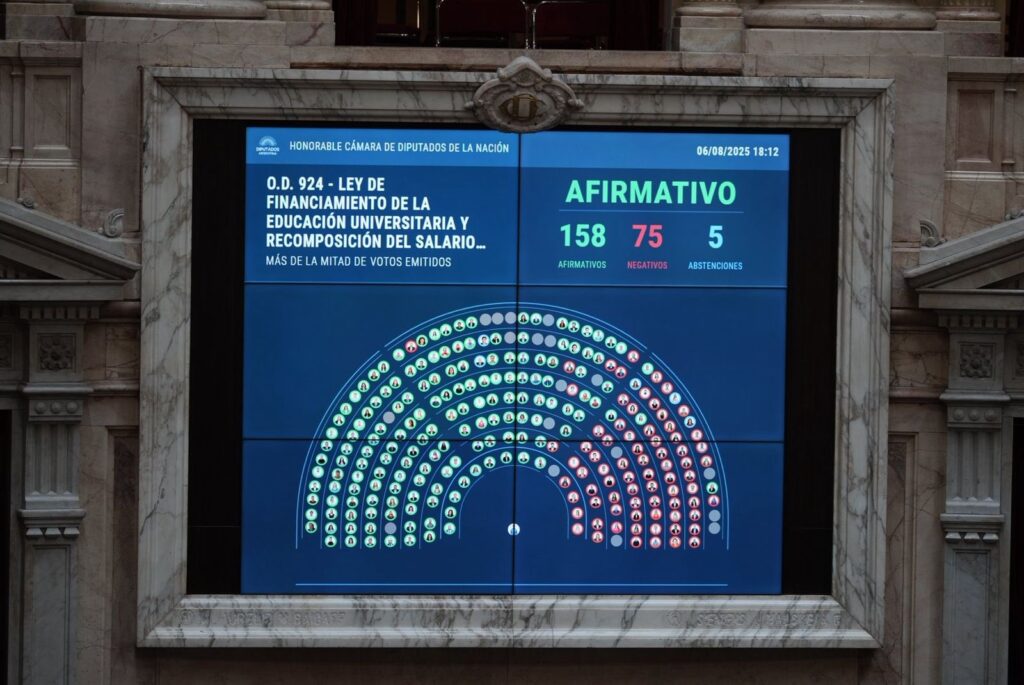 La Cámara de Diputados aprobó hoy en general el proyecto que otorga y actualiza fondos a las universidades nacionales por 158 votos afirmativos, 75 negativos y 5 abstenciones, y otorgó un duro golpe al gobierno de Javier Milei, que rechaza esa iniciativa.