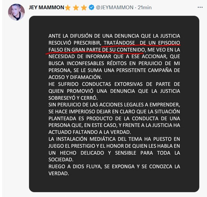 «Ante la difusión de una denuncia que la justicia resolvió prescribir, tratándose de un episodio falso en gran parte de su contenido, me veo en la necesidad de informar que a ese accionar, que busca inconfesables réditos en perjuicio de mi persona, se le suma una persistente campaña de acoso y difamación», comenzó el músico y humorista. .