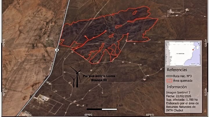 Los Bomberos Voluntarios de Trelew informaron que el incendio registrado los días 21 y 22 de febrero, a la vera de la Ruta Nacional 3 en el tramo que une Trelew con Puerto Madryn, afectó una superficie estimada en 1.700 hectáreas.