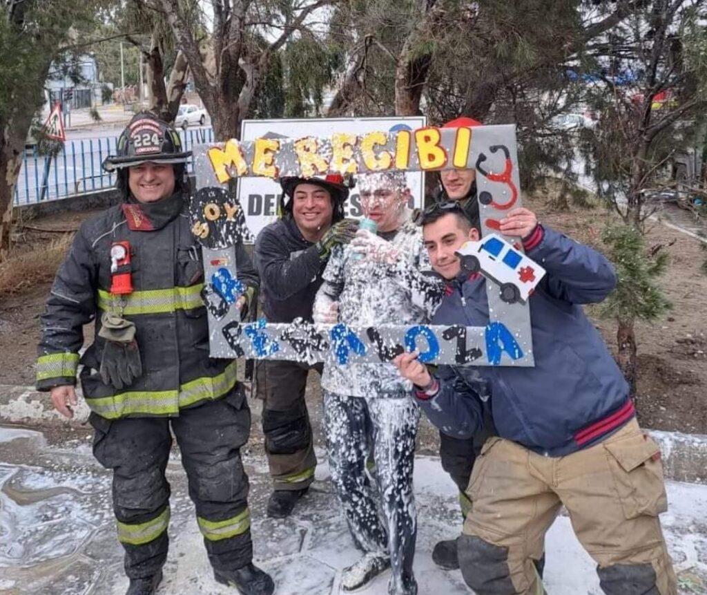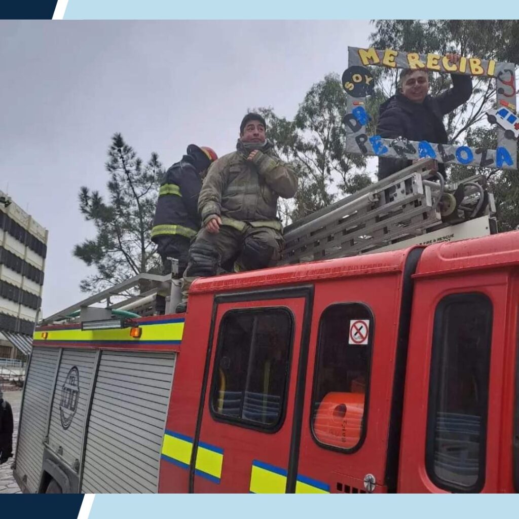 Él es bombero, y la particularidad de esta graduación, fue que no solo acompañaron sus más allegados, sino que también se hizo presente el Destacamento N° 2 de km 8 «Malvinas Argentinas» dependiente de la Asociación de Bomberos Voluntarios de Comodoro Rivadavia, es por eso que llevaron el autobomba hasta la universidad, en la tradicional «vuelta» del egresado, en representación de la brigada.