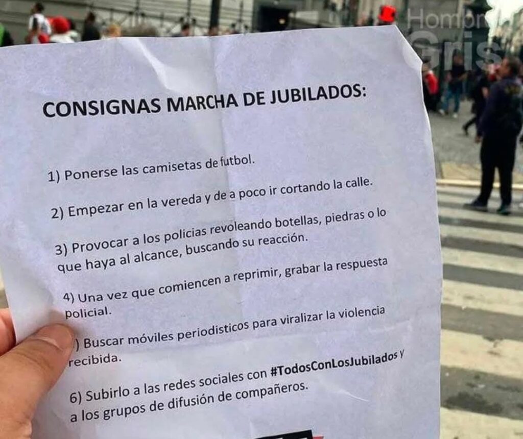 En ese contexto, durante la marcha repartieron afiches con instructivos para «provocar a la policía» y generar disturbios.