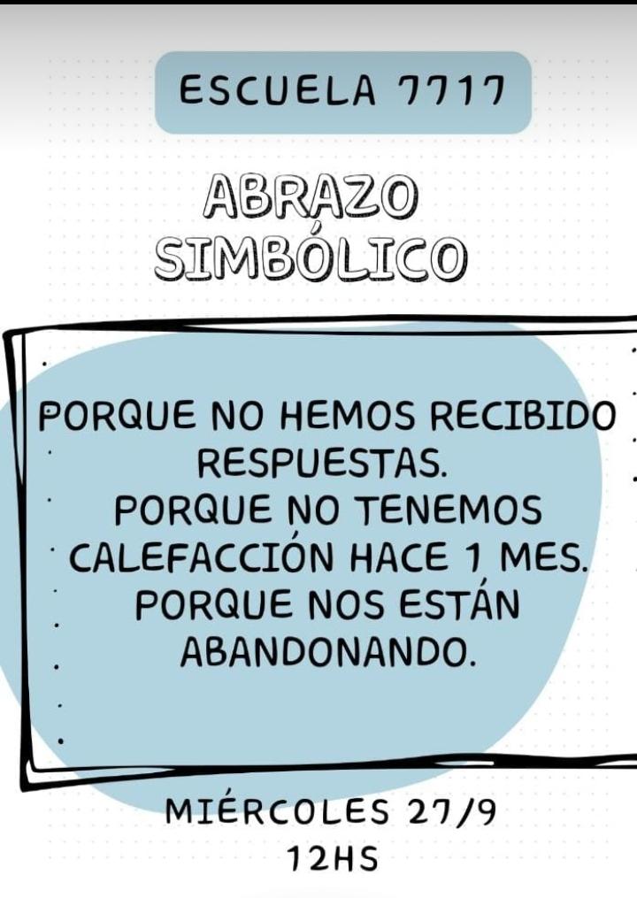 Desde la Escuela 7717 detallan que el abrazo simbólico se realizará porque hasta el momento no han recibido soluciones para los problemas de calefacción que sufre el establecimiento.