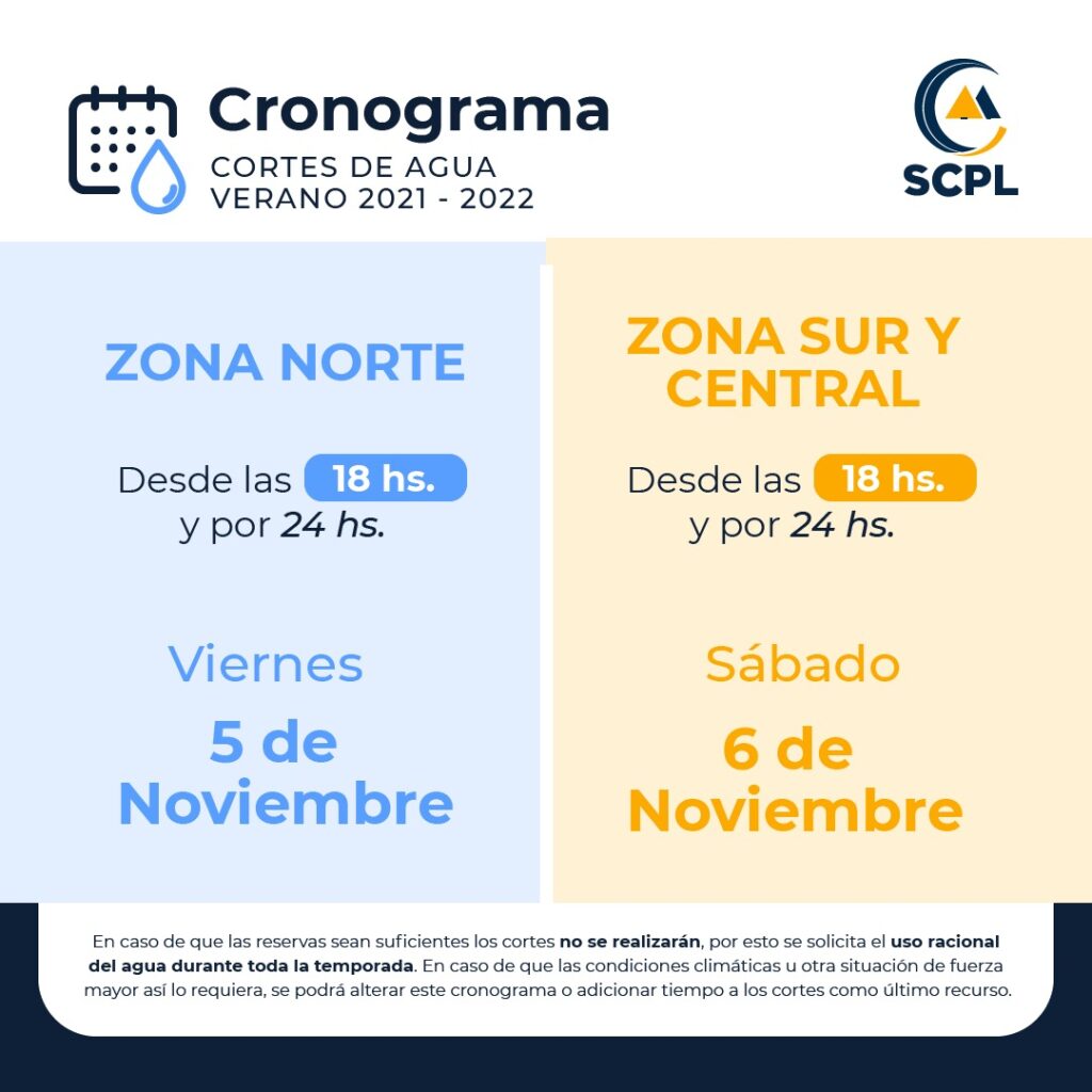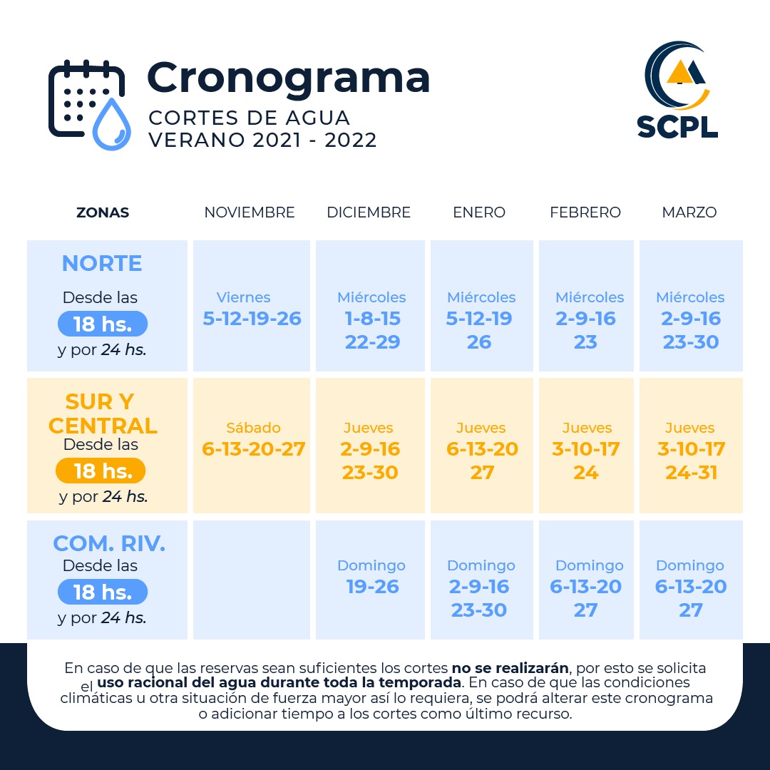 La Sociedad Cooperativa Popular Limitada informó el cronograma de cortes de verano del servicio de agua. El mismo inicia hoy en zona norte y tiene como objetivo recuperar reservas en el Puesto La Mata.