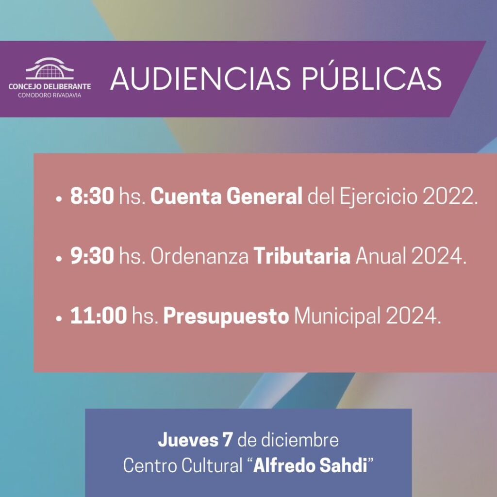 Desde la cuenta oficial de Facebook, el Concejo Deliberante anunció que las inscripciones para participar de las Audiencias Públicas están abiertas. Será vía email, escribiendo a esta dirección mesadeentrada@concejocomodoro.gob.ar o de manera presencial en las instalaciones del Concejo Deliberante (Pellegrini 776), de 8 a 15 hs.