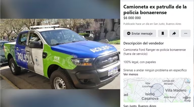 Es que se encontraron con un posteo en el que ofrecen un patrullero de la Policía Bonaerense por $6 millones. «Camioneta ex patrulla de la Policía Bonaerense» es el título de la publicación que indica que sería de alguien de San Justo, en la provincia de Buenos Aires.