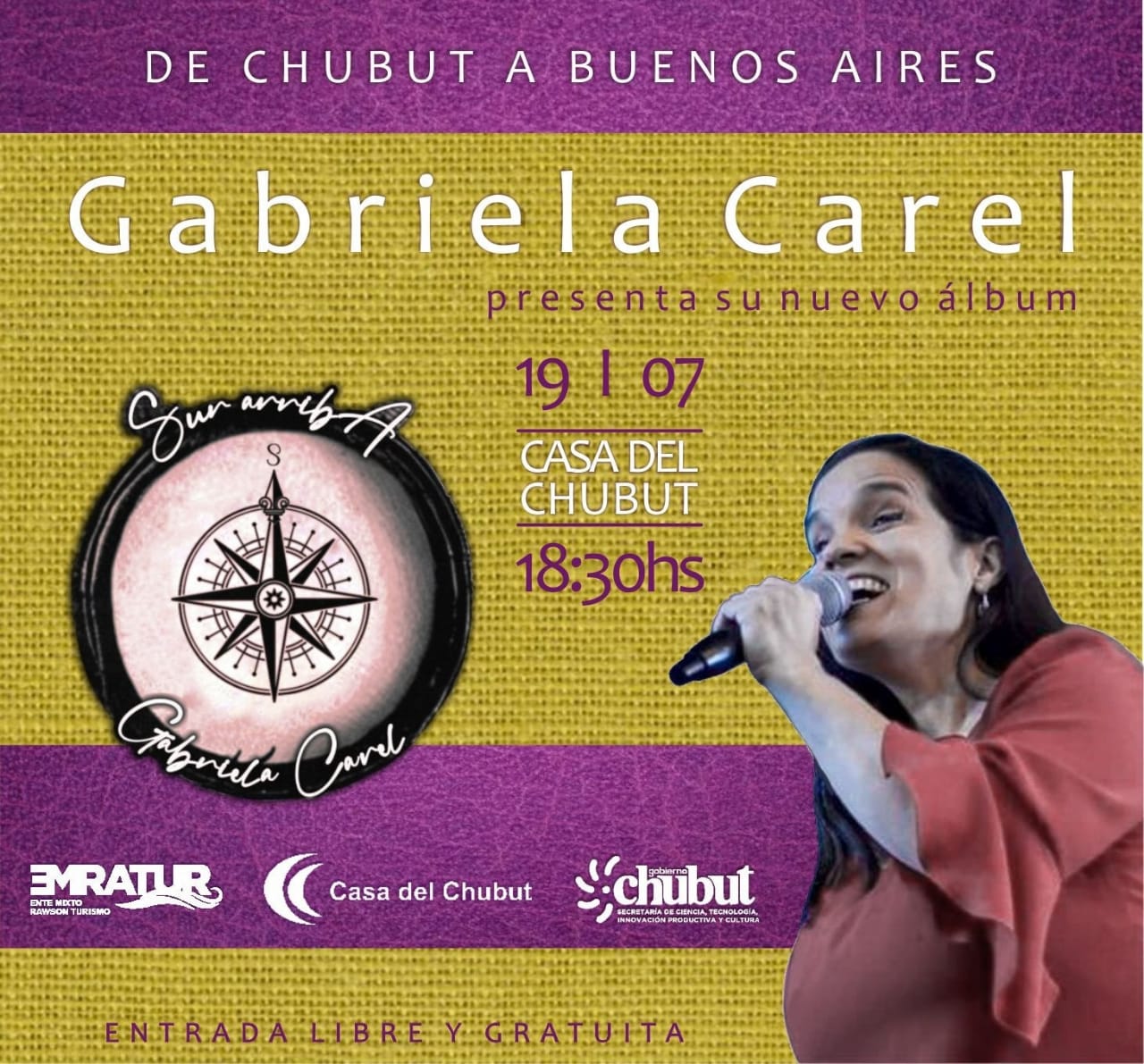 La folclorista chubutense, Gabriela Carel, presentará junto a sus músicos su nuevo disco “Sur Arriba”, este miércoles 19 de julio en la Casa del Chubut en Buenos Aires. La cita será a las 18.30 en Sarmiento 1172, con entrada libre y gratuita. Se espera la presencia de público en general como así también de prensa especializada. A su vez, Marta Aranda, reconocida vecina de Trelew por su otra pasión, la medicina, ya que supo ser una reconocida obstetra en el Valle, exhibirá su primera exposición de pintura.
