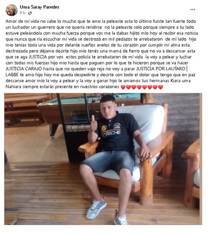 A través de las redes sociales, la mamá de Lautaro L expresó: «Amor de mi vida no sabe lo mucho que te amo la peleaste asta lo último fuiste tan fuerte todo un luchador un guerrero que no quería rendirse no la peleaste solo porque siempre a tu lado estuve peleándola con mucha fuerza porque vos me la dabas hijito mío hoy al recibir esa noticia que nunca quería escuchar mi vida se destrozó en mil pedazos te arrebataron de mi lado hijo mío tenias toda una vida por delante sueños anhelos de tu corazón por cumplir mi alma esta destrozada pero déjame decirte hijo mío tenés una mamá de fierro que no va a descansar asta que se haga JUSTICIA por vos estos policía te arrebataron de mi vida la voy a pelear y luchar con todas mis fuerzas hijo mío hasta que paguen por lo que te hicieron porque se va hacer JUSTICIA CARAJO hasta que no queden bajo reja no voy a parar JUSTICIA POR LAUTARO LABBE te amo hijo hoy me queda despedirte y decirte con todo el dolor que tengo que en paz descanse amor mío la voy a pelear y la voy a ganar hijo te amamos tus hermanas Kiara una Nahiara siempre estarás presente en nuestros corazones».