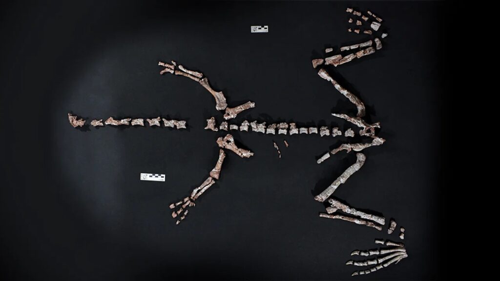 Los restos fósiles que se encontraron son una parte del cráneo, extremidades anteriores y posteriormente completos, y una serie vertebral completa hasta la cola, según informó el organismo en su página oficial.