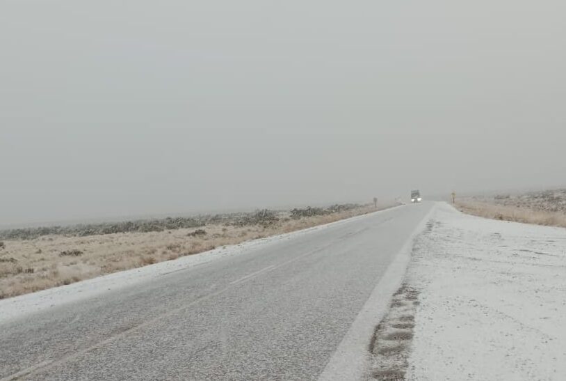 Así se encontraba en horas de la mañana, nieve el tramo de la ruta Comodoro – Garayalde. Piden circular con cuidado.