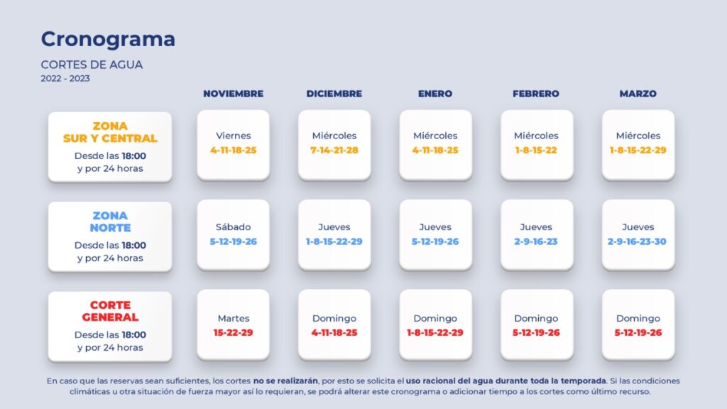 Desde la Cooperativa se dio a conocer cómo será el cronograma de cortes programados de noviembre de 2022 a marzo 2023 en condiciones normales de abastecimiento. Además, como cada año, se solicita a toda la comunidad el uso responsable del servicio de agua, para que los cortes sean menos extensos y con menor frecuencia.