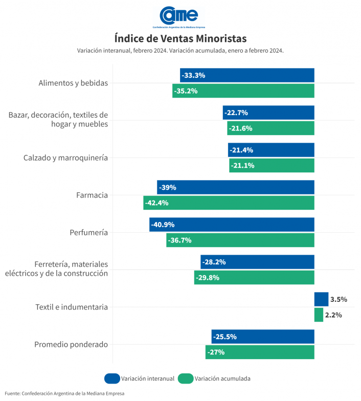 Así surge del Índice de Ventas Minoristas Pymes de la Confederación Argentina de la Mediana Empresa (CAME), elaborado en base a un relevamiento mensual entre 1.350 comercios minoristas del país, realizado del 26 de febrero al 1 de marzo.