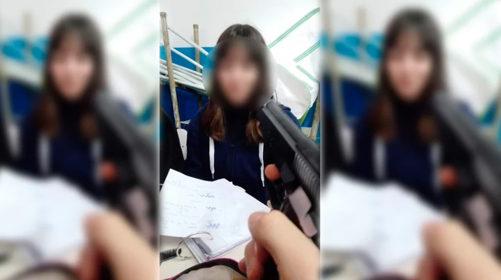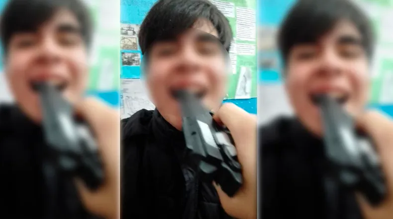 Entre las imágenes que tanto el joven que llevó el arma como sus compañeros subieron a las redes sociales se ve al alumno empuñando el arma y apuntándole en la nuca a otro, que está arrodillado en el suelo.