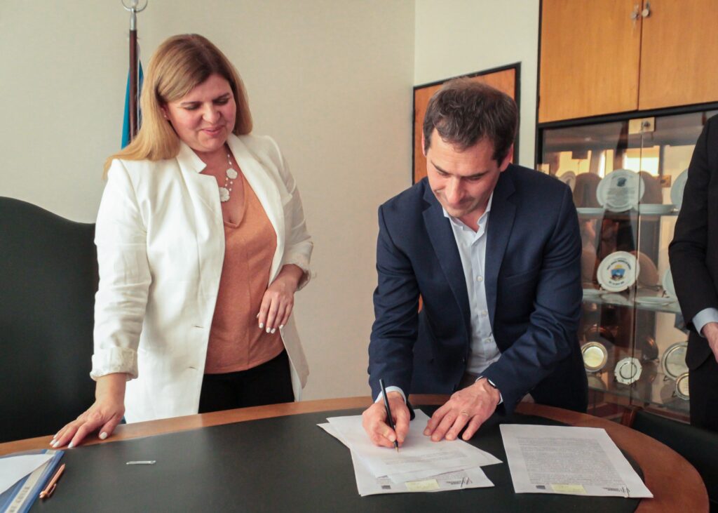 El mandatario comodorense firmó los acuerdos con la titular del SJT en horas de la tarde, acompañado por el asesor letrado del Municipio, Guillermo Hughes; y el secretario de Coordinación de Gabinete, Gustavo Fita.