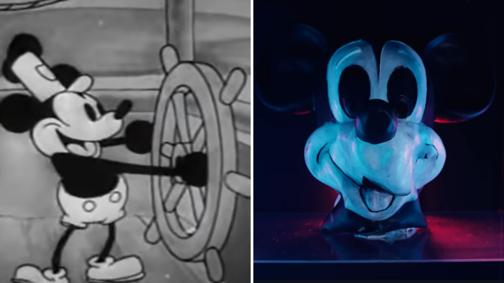 La primera ya tiene un tráiler en donde se ve el clásico animado por Walt Disney en el lejano 1928, Steamboat Willie (Barco de vapor Willie), intercalado con imágenes inéditas que cuentan la historia de un asesino con máscara de ratón -que claramente demuestra que es Mickey Mouse- que persigue a jóvenes universitarios.