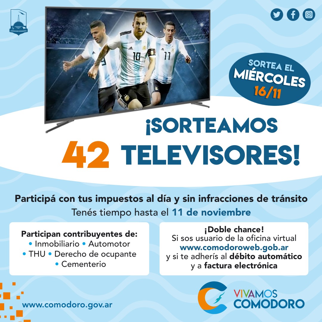 Asimismo, para efectuar estas consultas se encuentra disponible la Oficina Virtual en www.comodoroweb.gob.ar, donde además se puede gestionar la adhesión al débito automático y a la boleta electrónica, duplicando de esta manera las posibilidades de ganar uno de los 42 televisores. Cabe recordar que, abonando a través del débito automático, se obtiene un descuento del 10% en los respectivos impuestos.