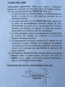 La empresa Patagonia Argentina S.R.L., adjudicataria de la licitación del Transporte Urbano de Pasajeros, emitió un comunicado en el que respondió a las críticas difundidas por Grupo MR S.R.L., empresa competidora por la licitación, y ratificó los beneficios de su oferta.