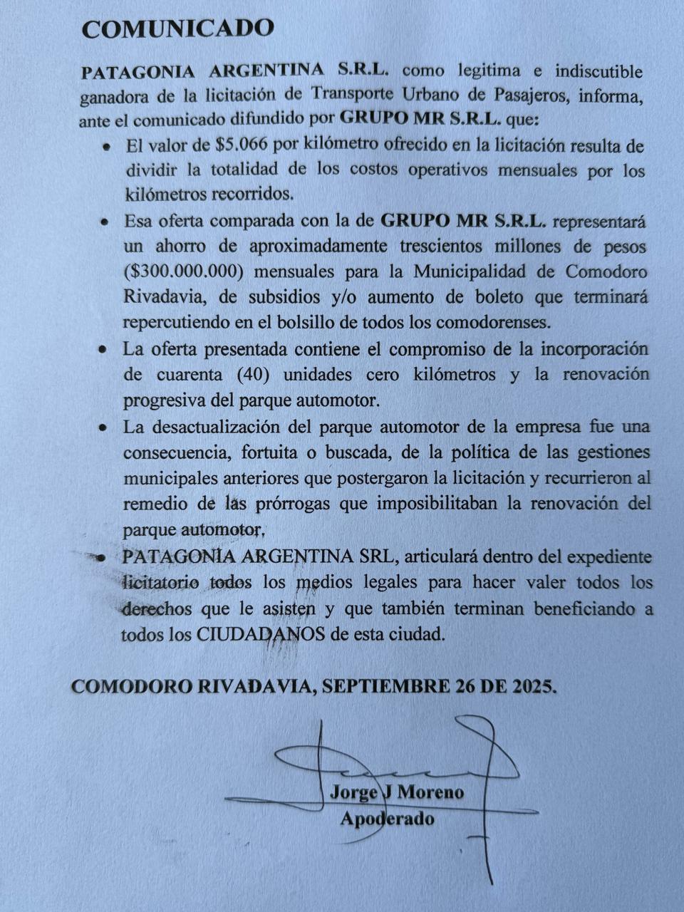 El comunicado, firmado por Jorge J. Moreno, apoderado de la empresa, fue fechado el 26 de septiembre de 2025.