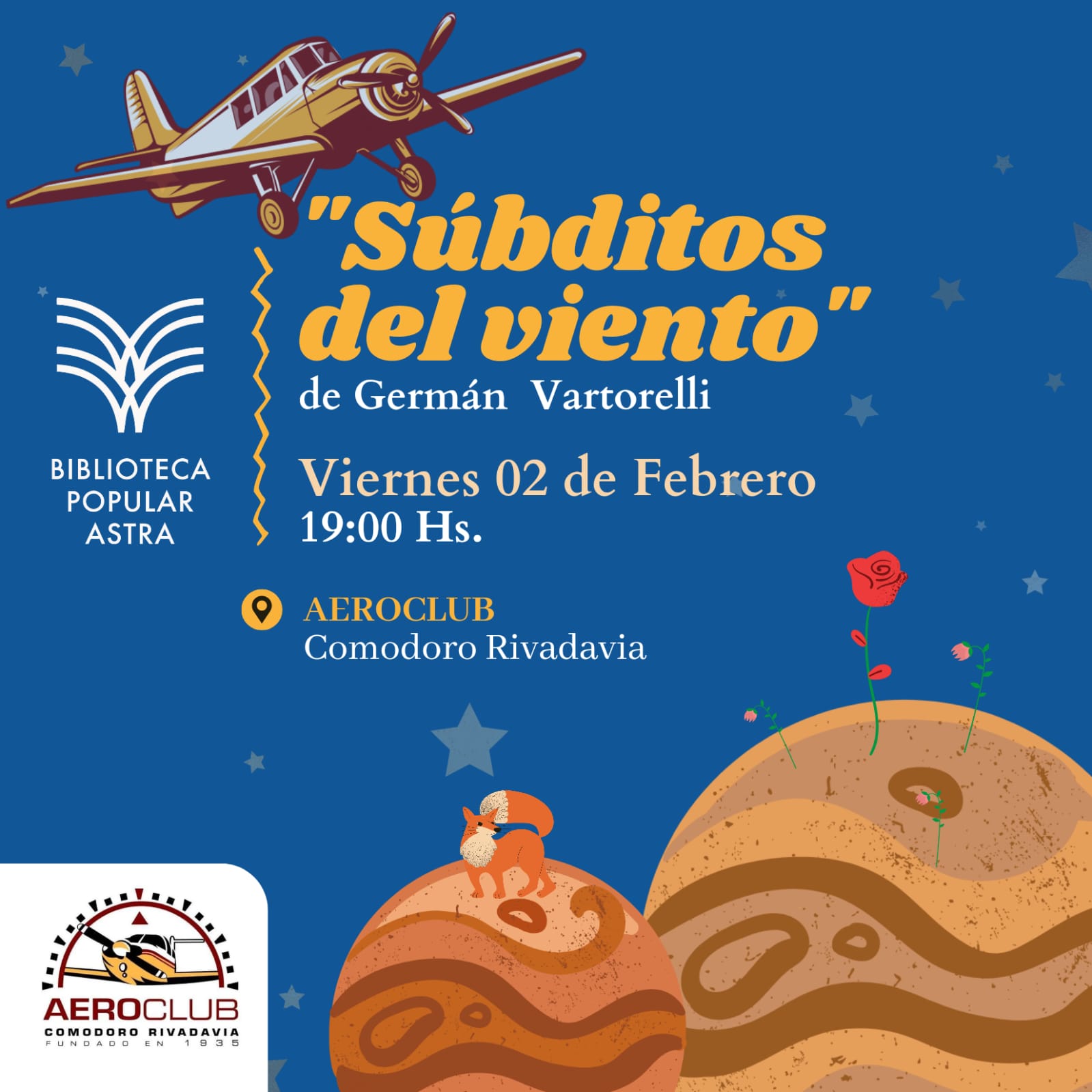 La Biblioteca de Astra tiene el agrado de invitar a la comunidad a la presentación del libro «Súbditos del viento», escrito por Germán Vartorelli, el cual aborda la vida de Saint Exupéry. Este evento se llevará a cabo el viernes 2 de febrero a las 19:00 horas en el Aeroclub de Comodoro Rivadavia.