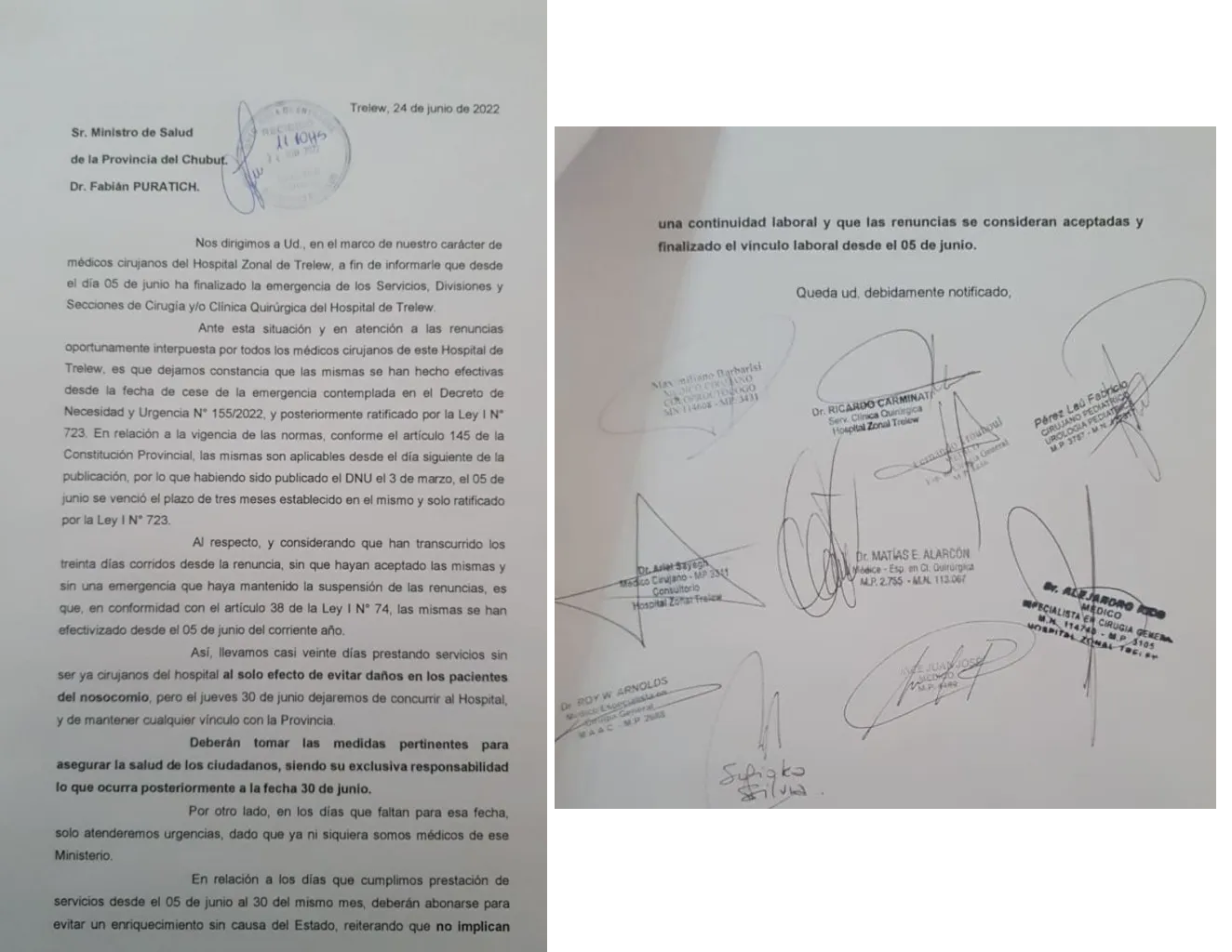 A través de una nota presentada al Ministro de Salud de la provincia, Fabián Puratich, 10 profesionales reiteraron que el 5 de junio pasado finalizaron los plazos de la Emergencia de los Servicios, Divisiones y Secciones de cirugía o clínica quirúrgica del nosocomio trelewense.