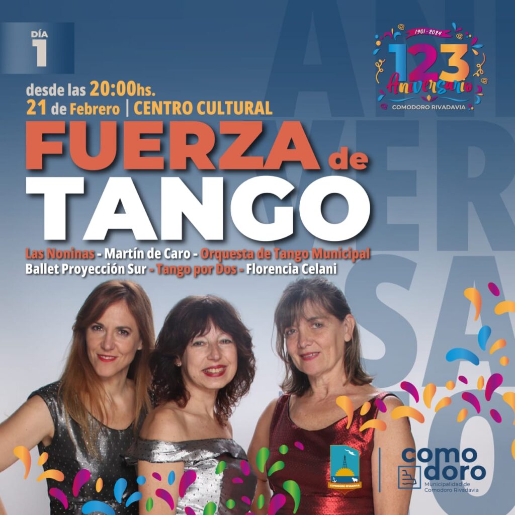 La fiesta comenzará el miércoles 21 de febrero en el Centro Cultural con «Fuerza de Tango», a partir de las 20 hs, un espectáculo que contará con la participación de Las Noninas, Martín de Caro, la Orquesta de Tango Municipal, Ballet Proyección Sur, Tango para Dos y Florencia Celani.