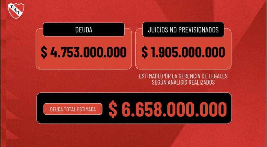 El presidente de Independiente, Fabián Doman, junto a sus vices, Néstor Grindetti y Juan Marconi, presentaron hoy en el Estadio Libertadores de América-Ricardo Bochini un informe detallado sobre la preocupante actualidad institucional y económica de la entidad de Avellaneda, mientras que informaron un pasivo que ronda los 7 mil millones de pesos por mes y pérdidas de 100 millones en el mismo lapso temporal.