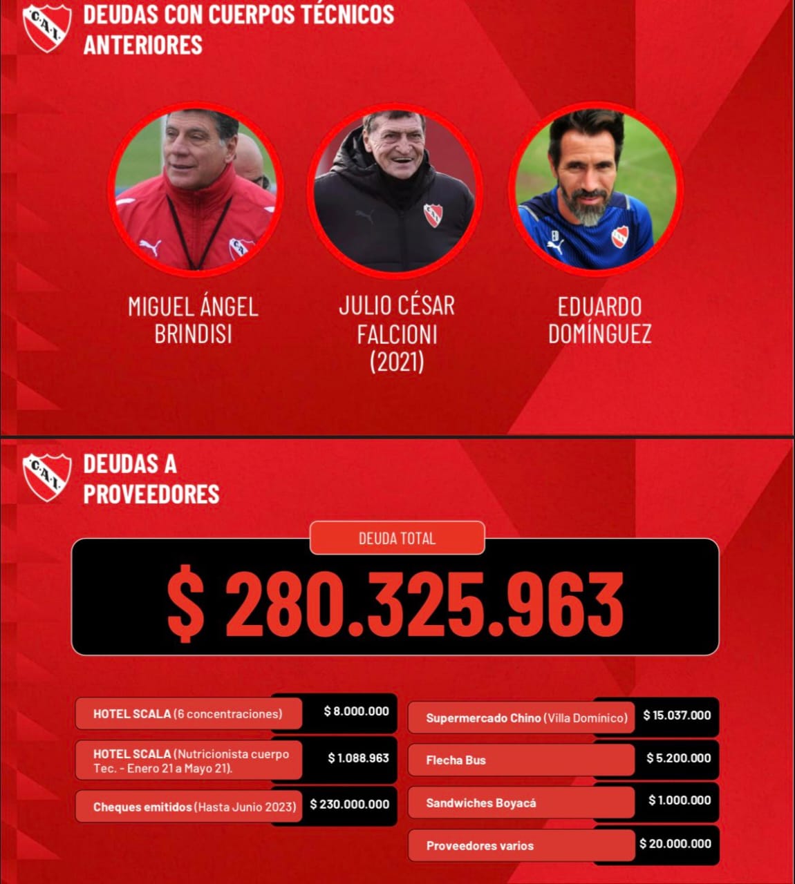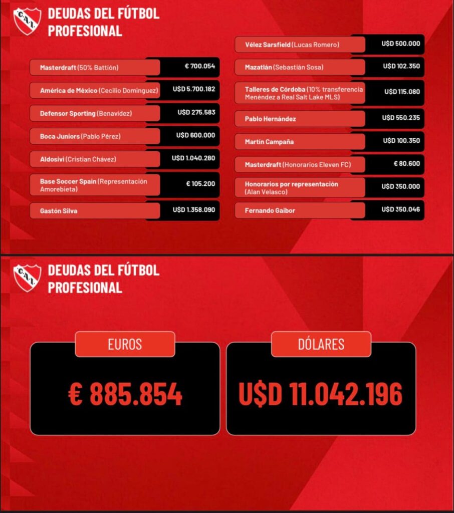 El ex ministro de Hacienda de la Ciudad de Buenos Aires agregó: «En jugadores hay deudas por 11 millones de dólares y 800 mil euros. También, hay 69 millones de pesos por premios individuales a los jugadores y 230 millones de pesos otorgados en cheques. Por otra parte, hay deudas con tres directores técnicos, Miguel Ángel Brindisi, Julio César Falcioni y Eduardo Domínguez».