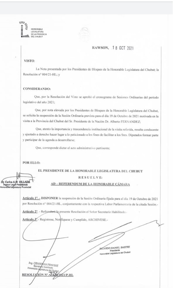 Este martes, la Honorable Legislatura de la Provincia del Chubut compartió la resolución n°326/21 en la cual se dispone la suspensión de la sesión fijada para el día 19 de octubre. Por resolución, se determinó suspender la Sesión Ordinaria prevista para este martes por la llegada del actual presidente, Alberto Fernández.