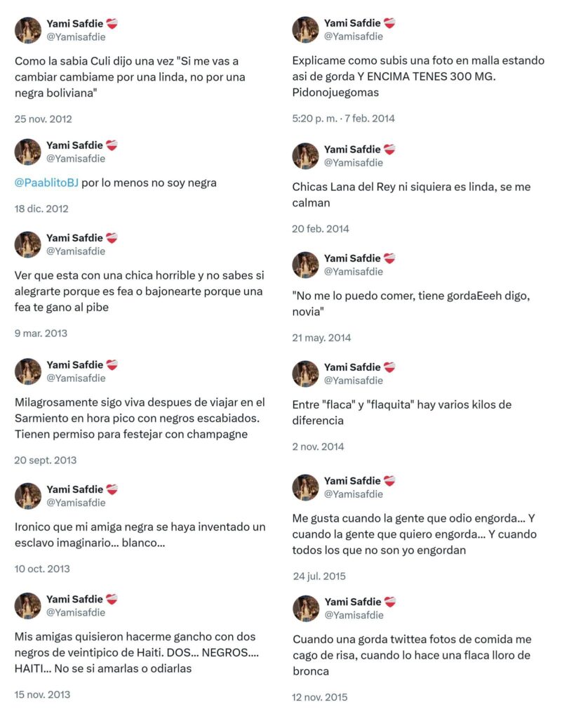 La cantante Yamila Safdie fue el centro de una fuerte polémica esta tarde cuando volvieron a salir a la luz publicaciones que datan de 2012 a 2018 en la red social X -en ese entonces Twitter-, en donde la artista realizó posteos discriminatorios por clase social, orientación sexual, físicos, racistas y xenófobos.