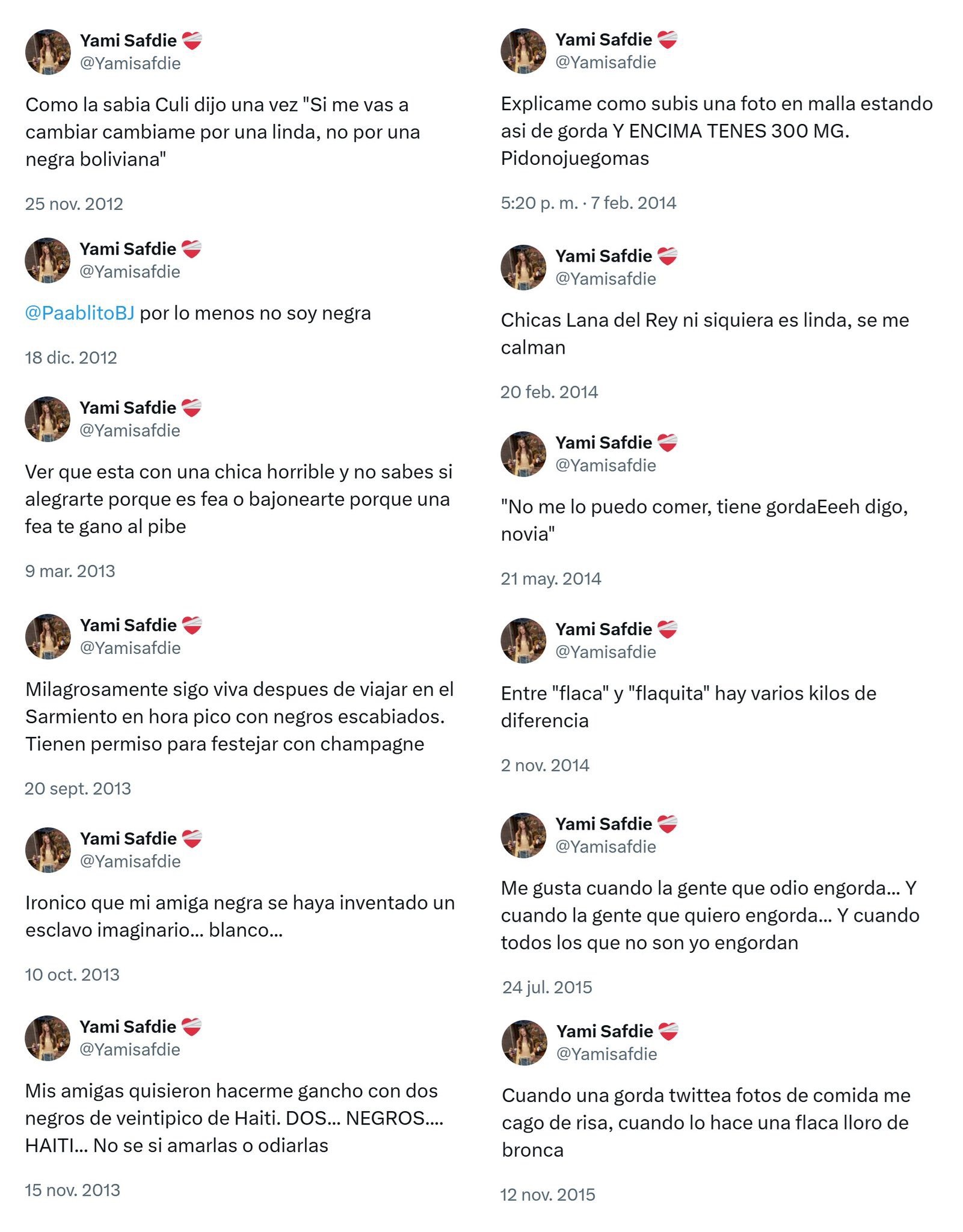 En octubre del mismo año, cerca de su cumpleaños número 16, la autora apuntó: “Irónico que mi amiga negra se haya inventado un esclavo imaginario blanco”. Tiempo después siguió: “Explicame cómo subís una foto en malla estando así de gorda y encima tenés 300 Me Gusta”.